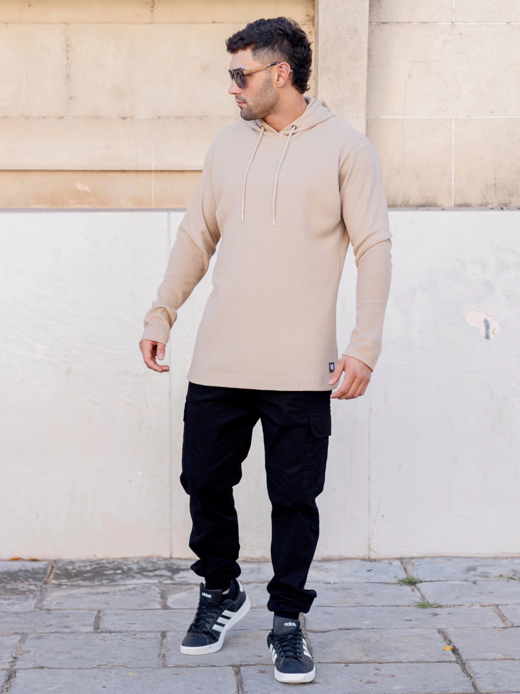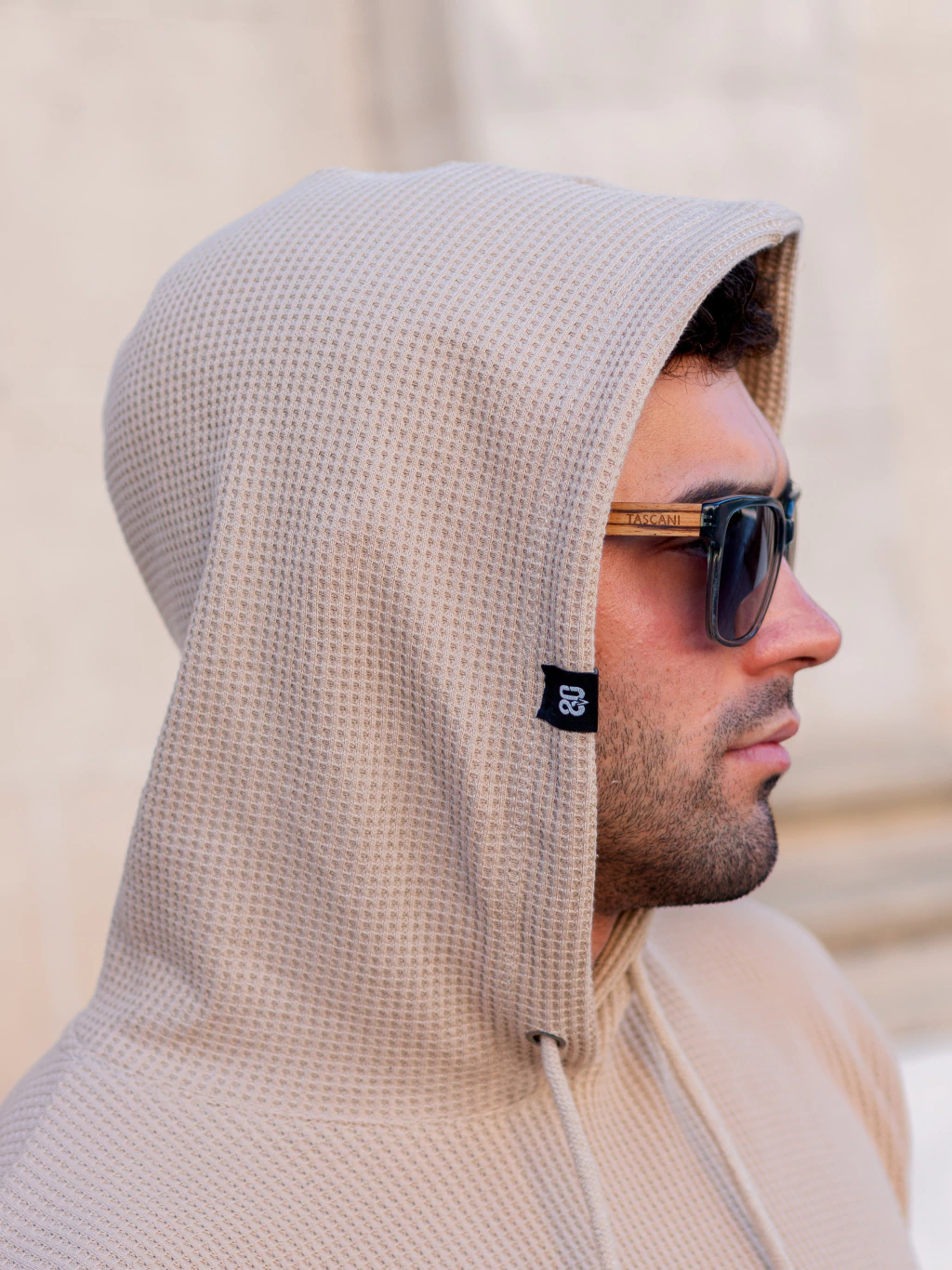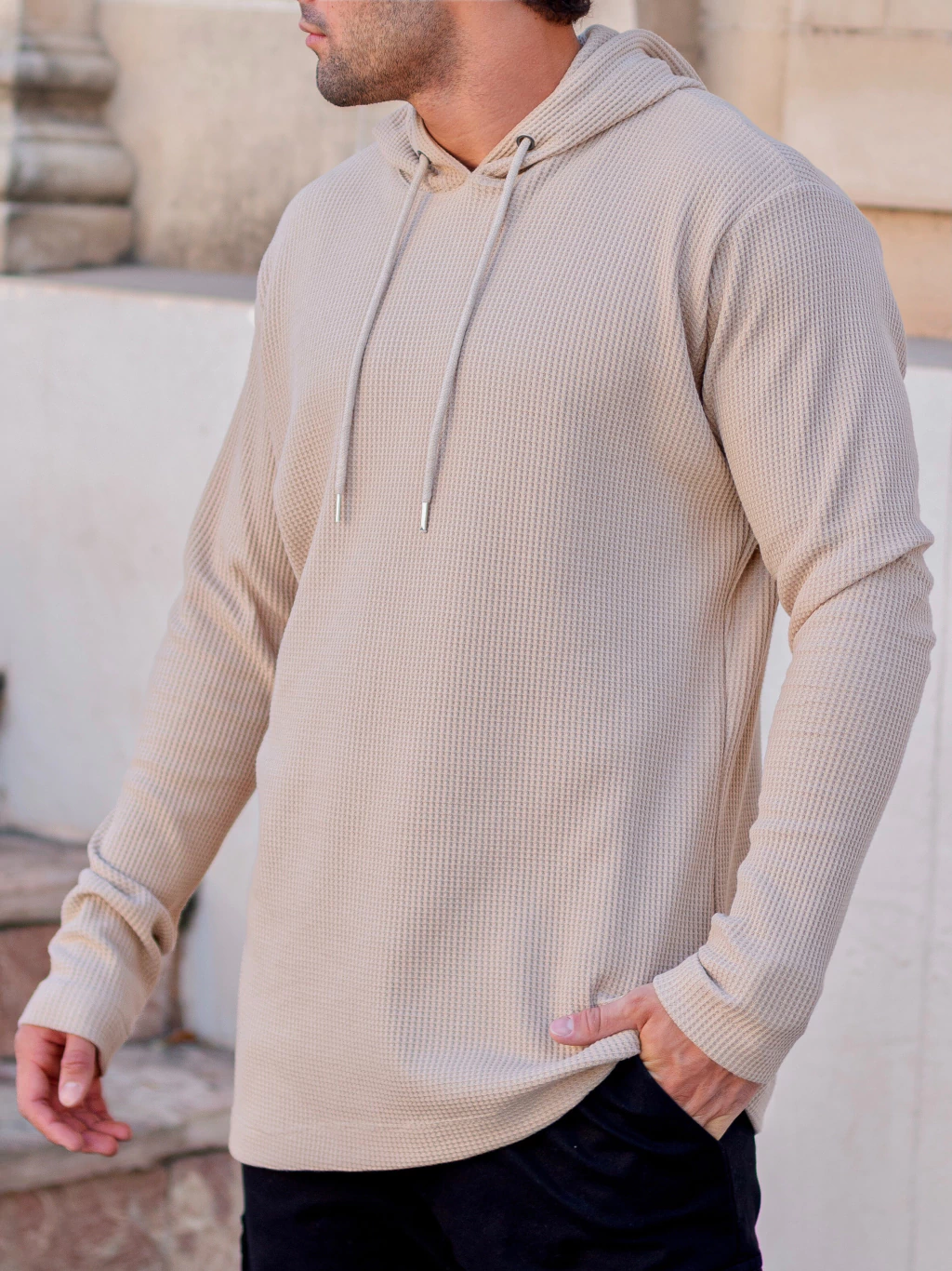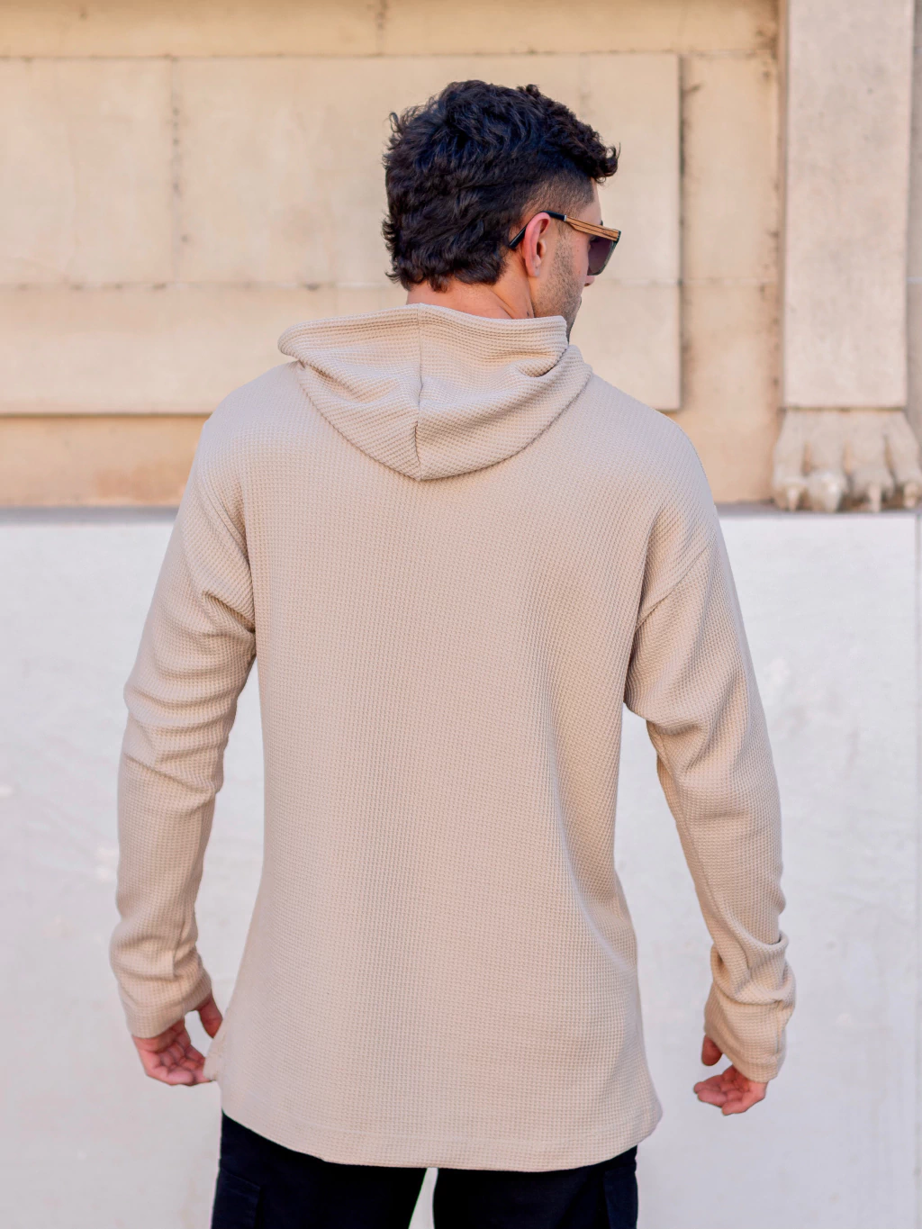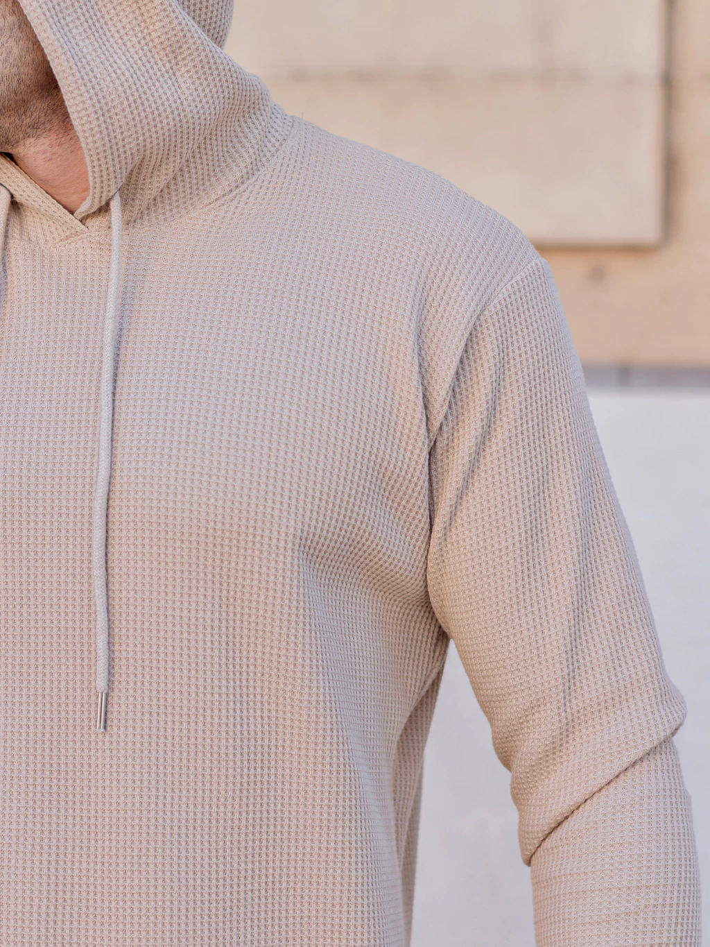 Buzo hoodie de tela de waffle, con capucha con cordones ajustables, corte oversize.