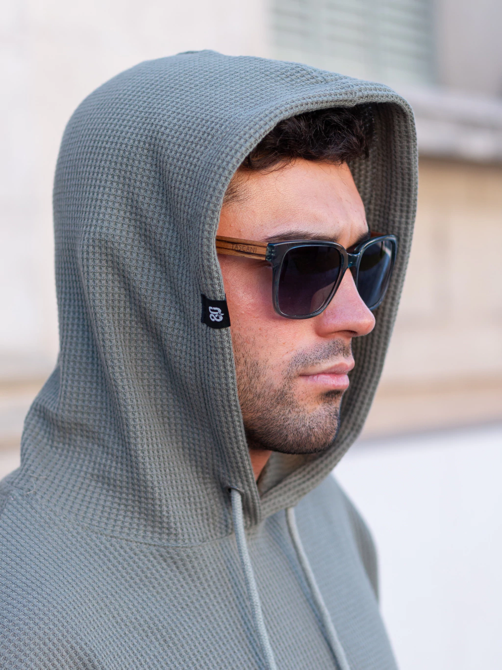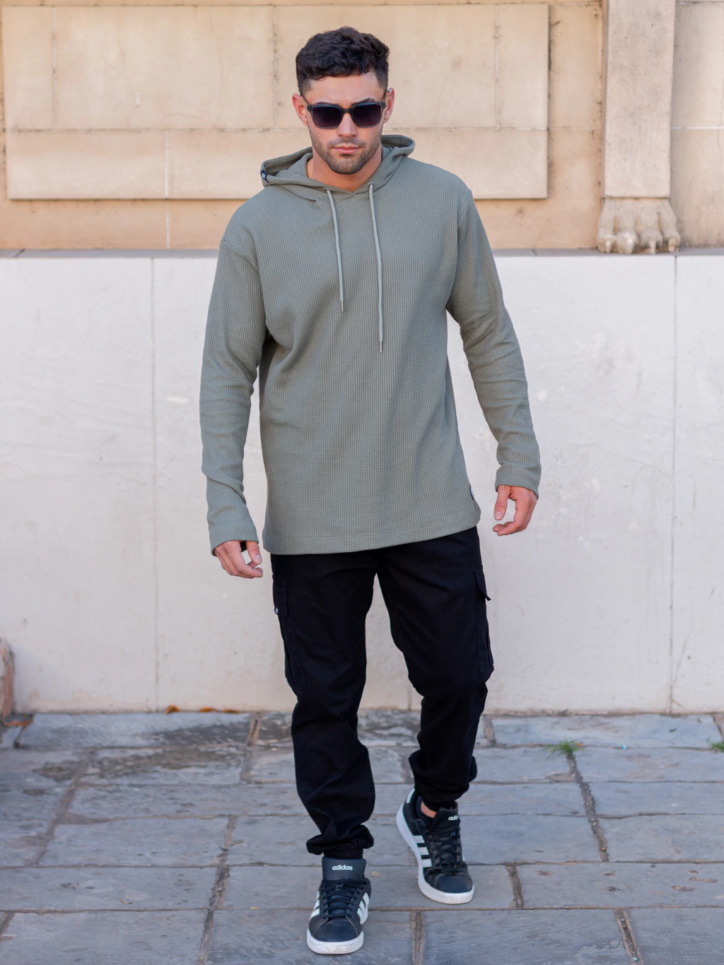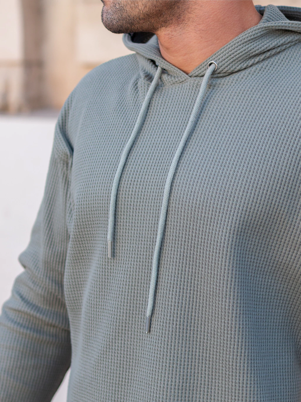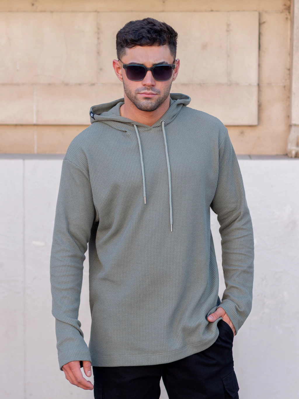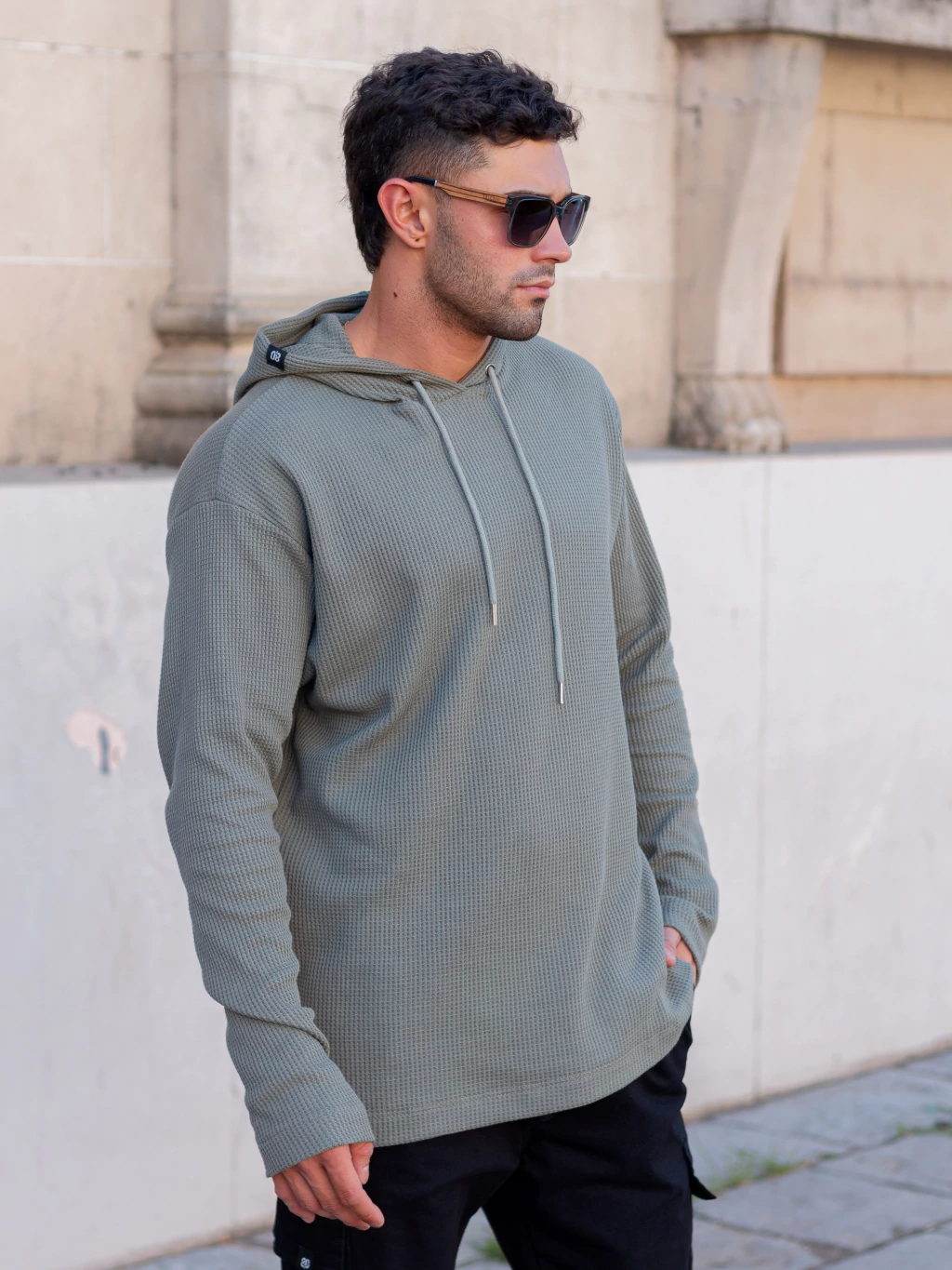 Buzo hoodie de tela de waffle, con capucha con cordones ajustables, corte oversize.