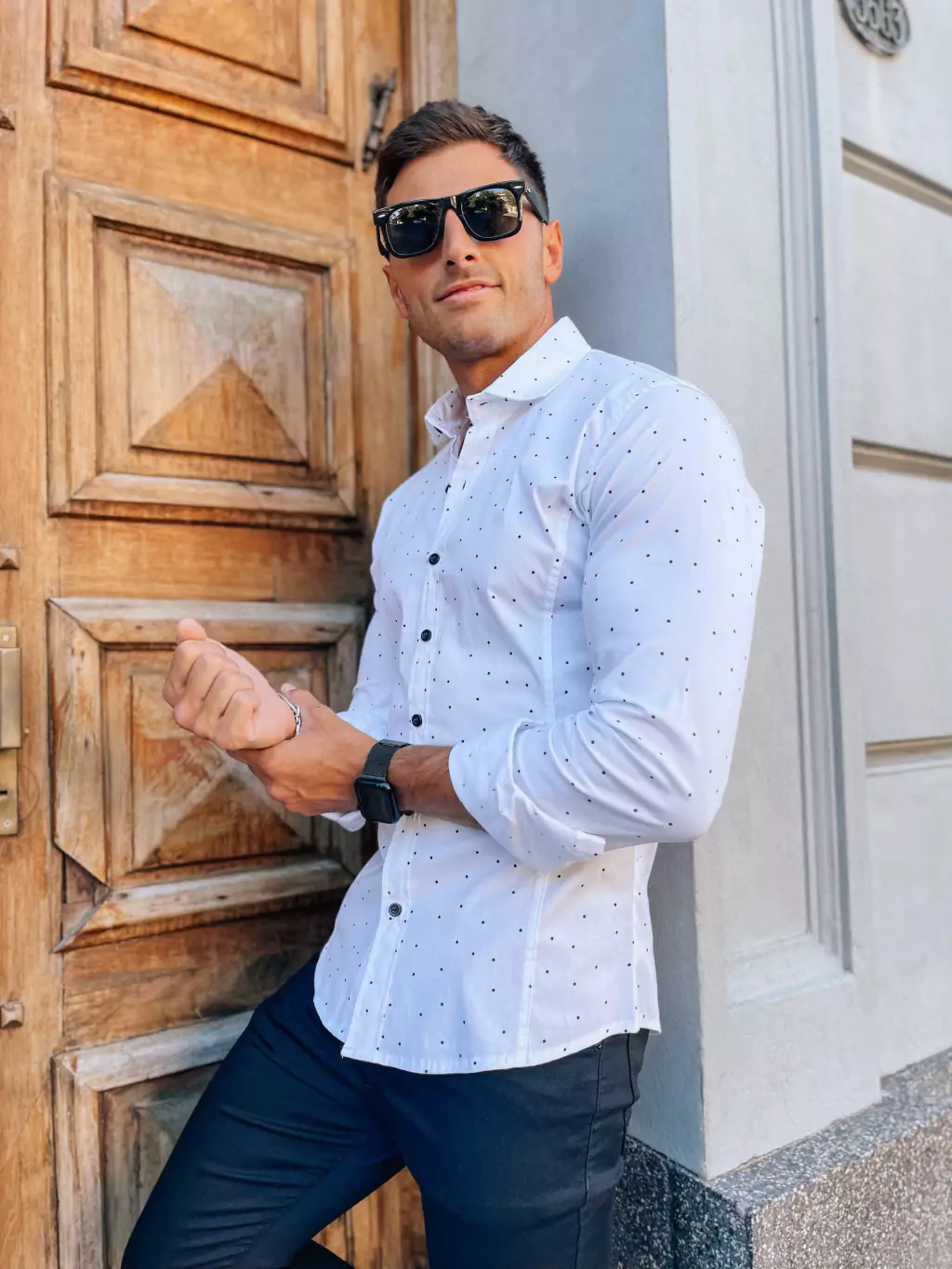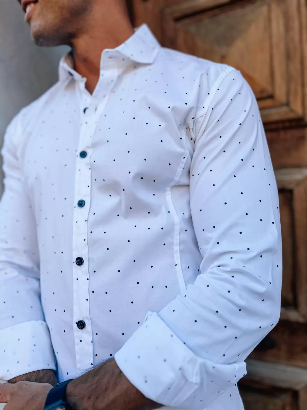Camisa blanca con lunares, con cuello italiano. Botones negros. Fresca, elegante.