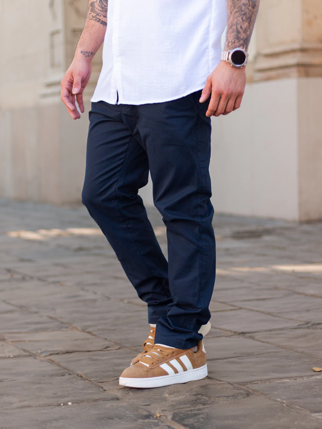 Pantalón de gabardina, con bolsillos traseros corte chino. Cintura rígida con pasacintos y botamanga de corte regular.