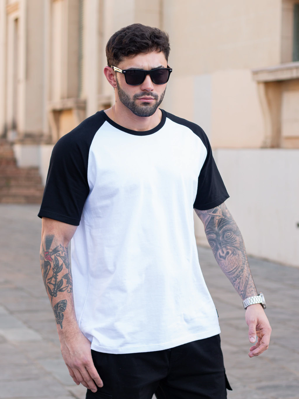 Remera tipo Ranglan. Pecho y espalda blanca, mangas negras.