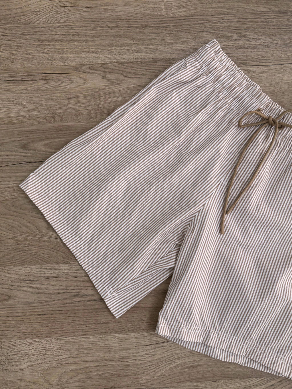 Short de baño texturizado de secado rápido, con diseño de rayas finas, con dos bolsillos laterales, cintura elastizada y cordón ajustable para garantizar un calce percefcto. Interior de red. Confeccionado con materiales importados de primera calidad.