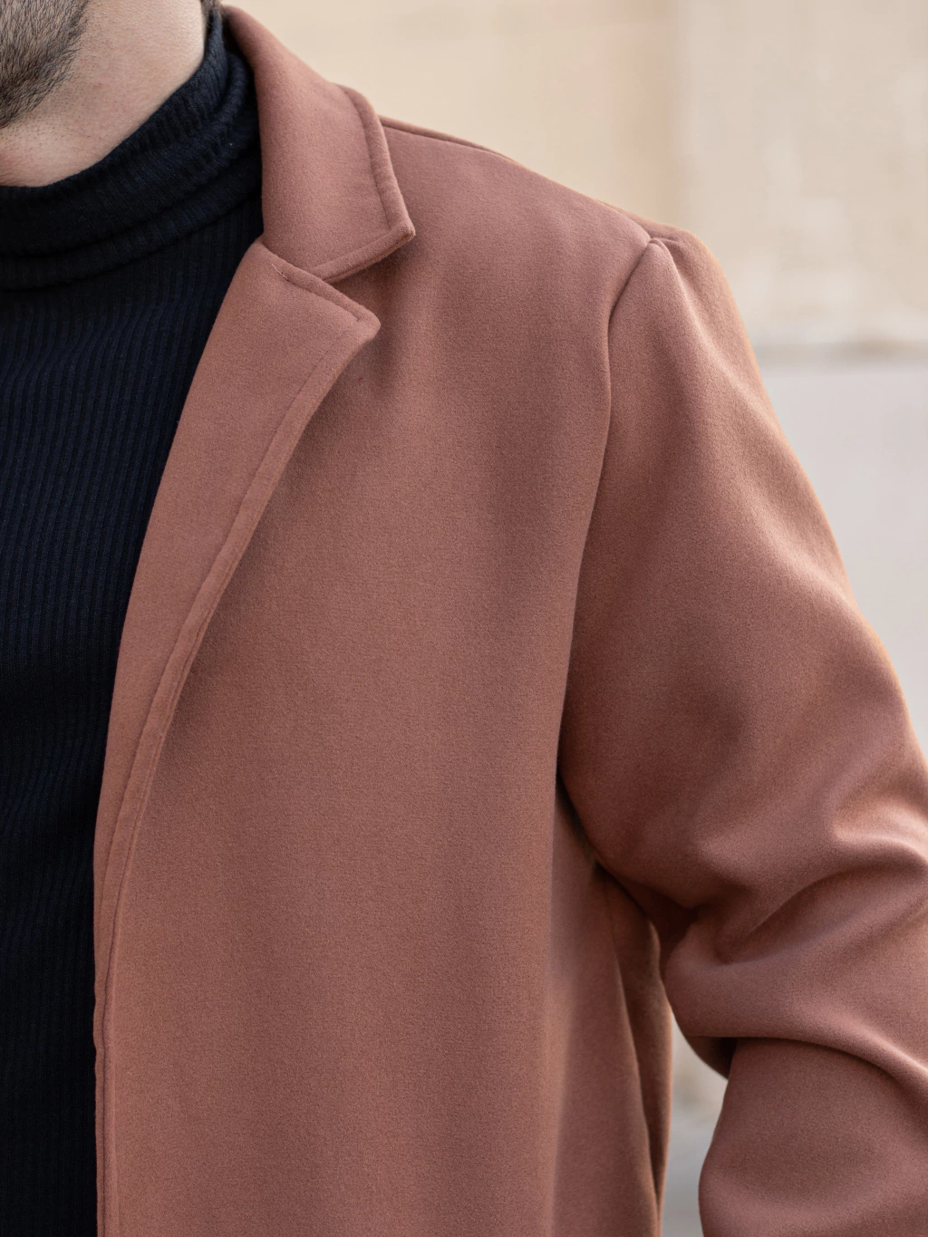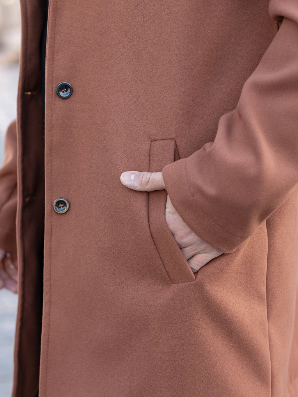 Tapado de paño largo forrado con dos botones al frente y bolsillos a los costados.